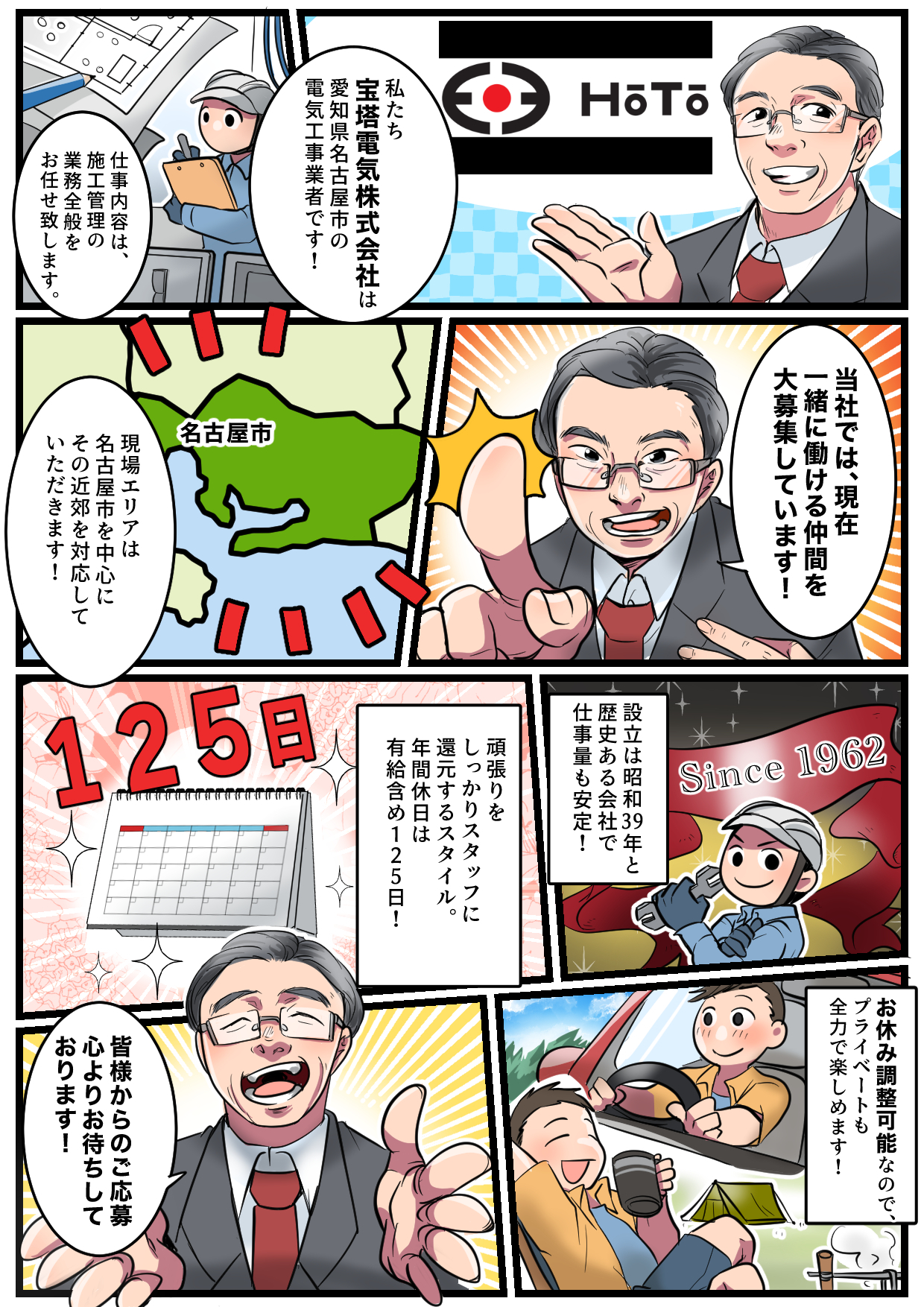 わたしたち宝塔電気は名古屋市を拠点とし、北は岐阜市、南は知多半島、そして東は岡崎市、西は四日市市を主なエリアに、電気設備工事を手掛けています。現在にマンションの電気設備工事など多くのご依頼を頂いており、安定した業務量があります。今後も取引先の期待に応えられるよう、組織体制の強化に伴い、新メンバーを募集することになりました。